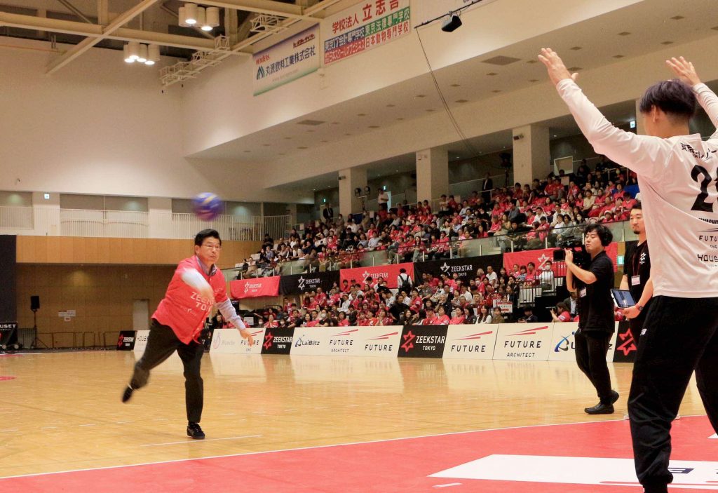 今シーズンのひがしんアリーナ開幕戦となる10 月9日(木)の試合では、⼭本区⻑の始球式で試合が開始され、その後、ハーフタイムに大勢のファンの前で、山本区⻑とジークスターエンターテインメント株式会社の⿊⽥代表取締役社⻑が協定書に調印を交わしました。