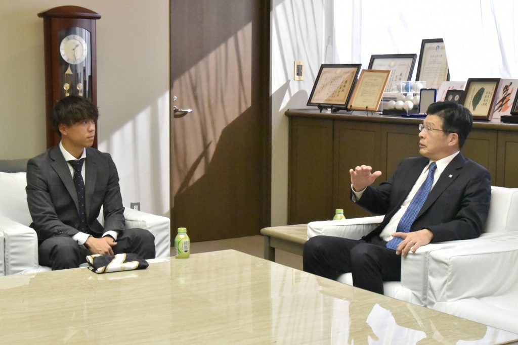 区長と小学生時代、ジュニユース、高校時代の話しから現在の栃木シティーFCでの活動について、また今後の目標などの話をし、区長から今後の活躍を祈念して激励のお言葉をいただきました。
